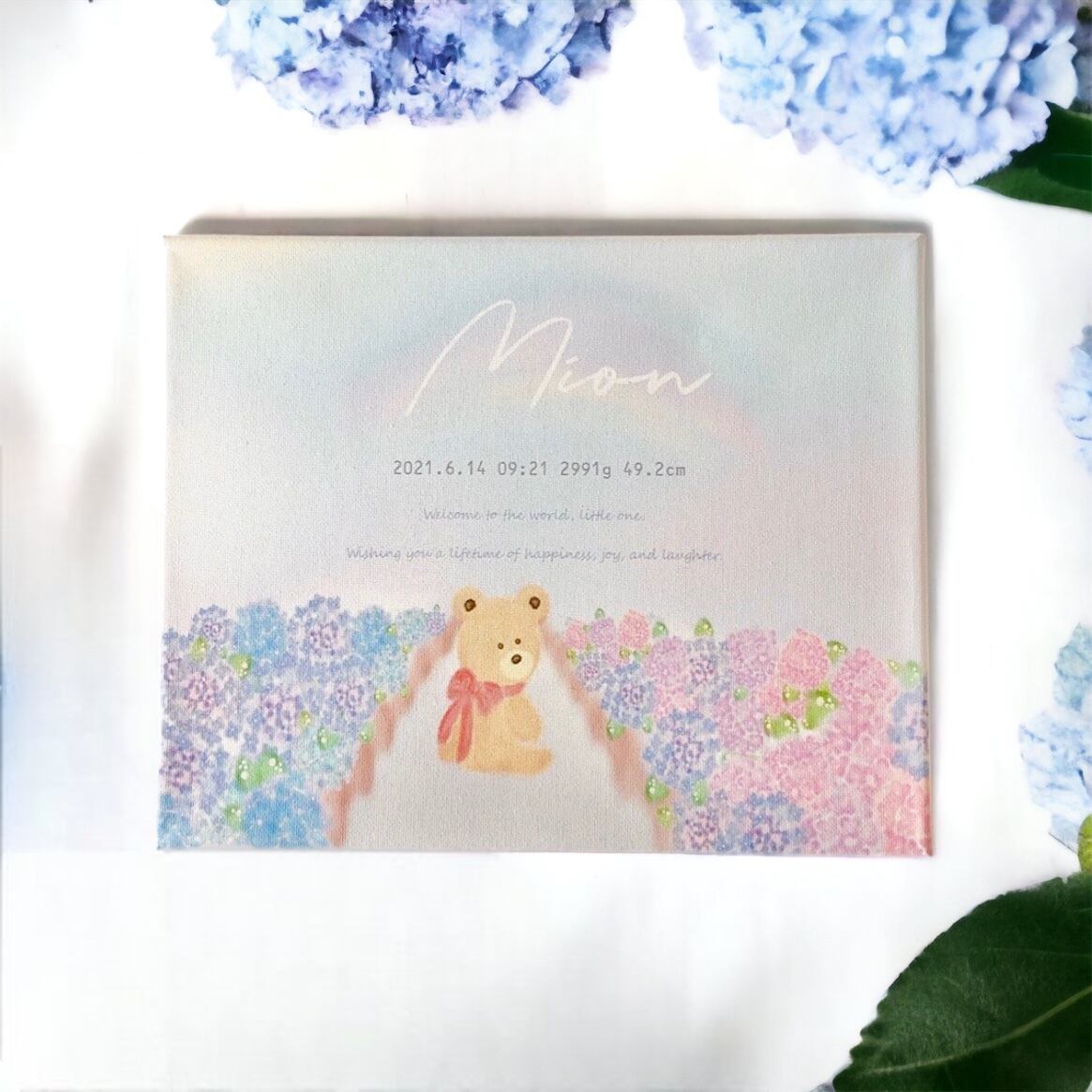 雨が上がって虹がかかったお空をイメージしました。虹はスピリチュアル的には「幸運の知らせ」と言われています♡ママにとっては、我が子に出会えたことがまさに幸運ですよね。
