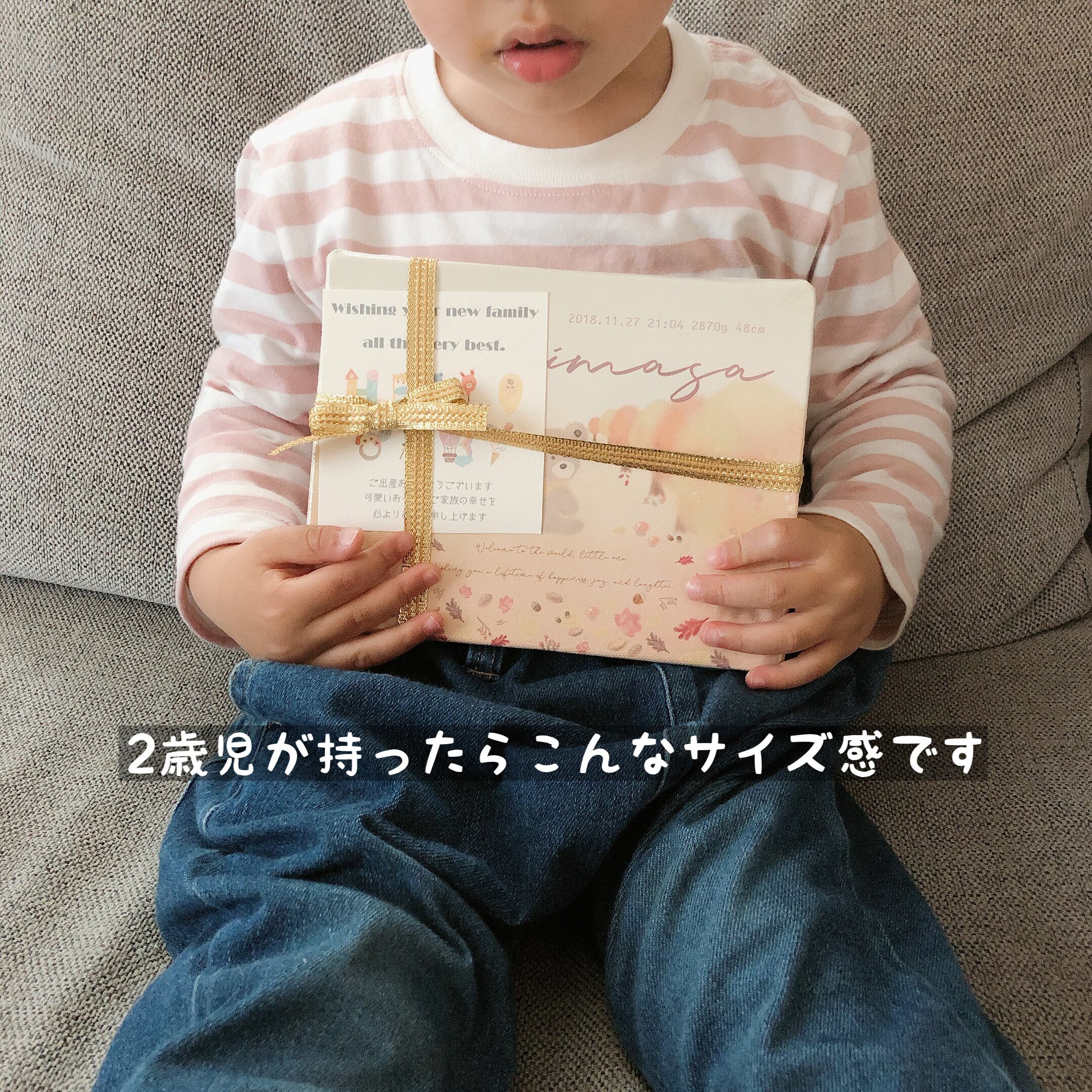 通常の包装で、リボン十字結び&出産祝いカードを入れます。