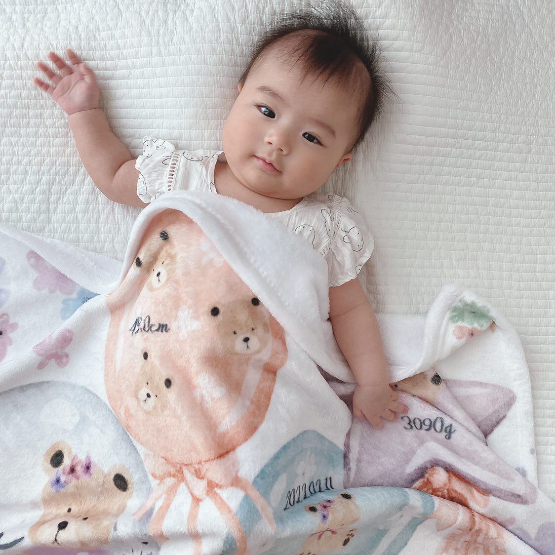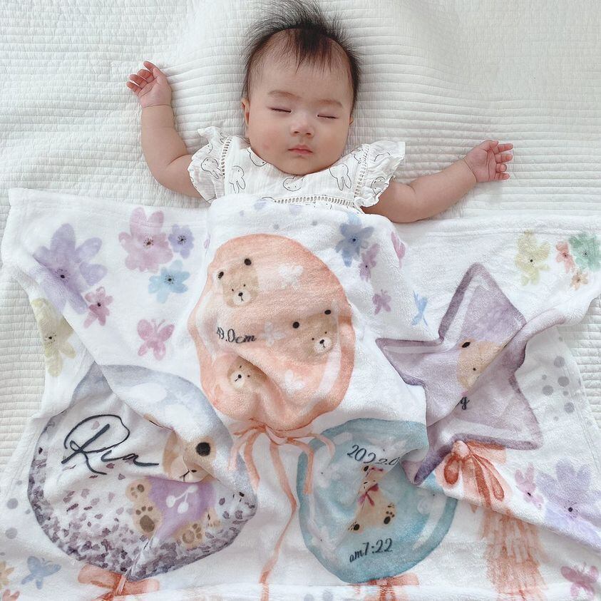 水彩カラーのバルーンにくまさんと名前や誕生日等が印字されたようなデザインが