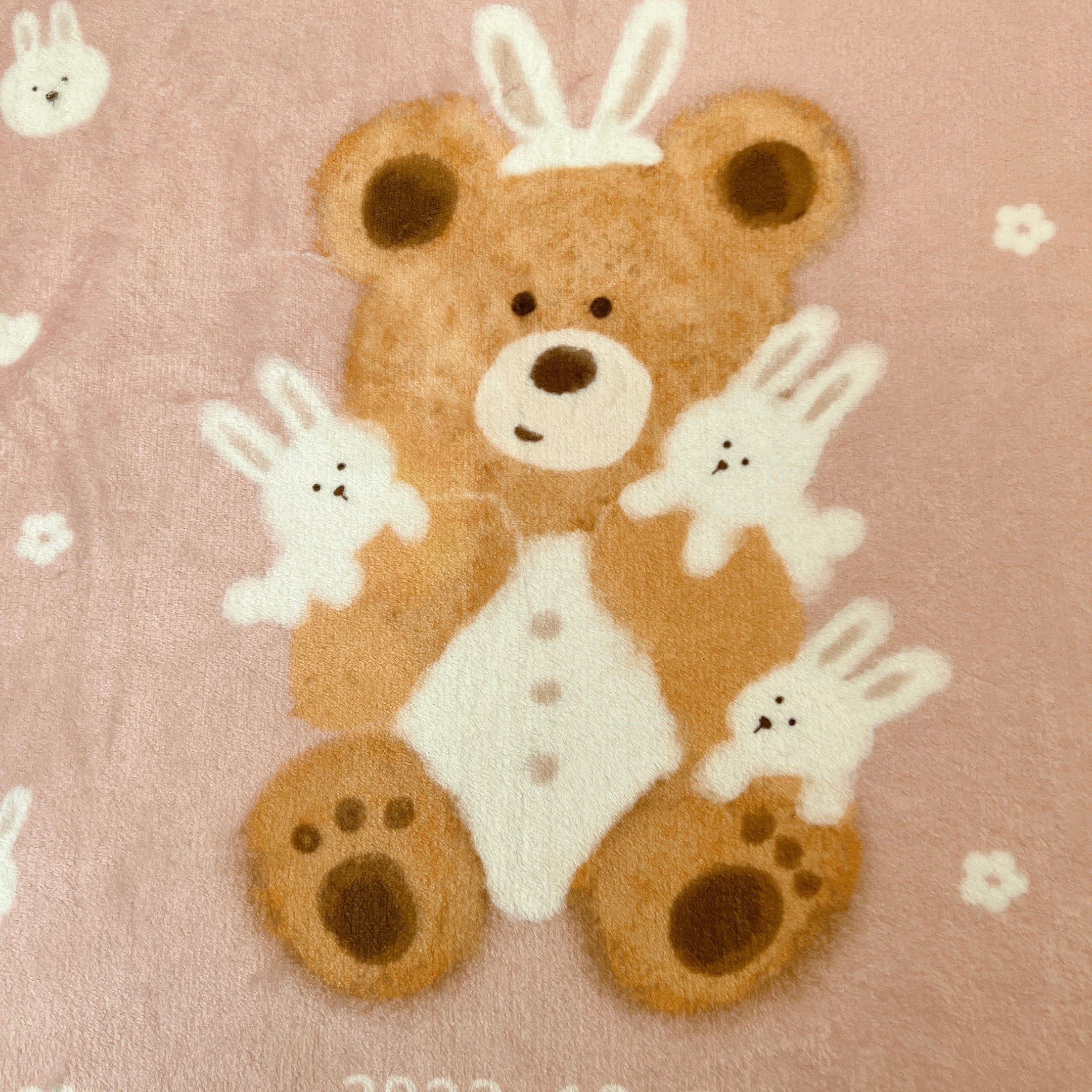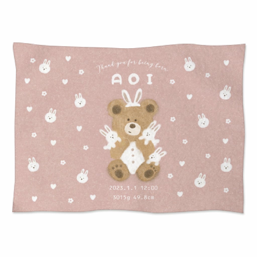まわりのふわふわハートやお花、うさぎちゃんの柄が兎年生まれのベビーにもピッタリ。